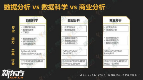 对于将来想要进入这个行业的同学,会面临一个选择问题:如何快速找到自己的定位,哪个公司是目标公司。在数据分析的全景图里面,我们可能所在的方块是哪个。面对这些选择,早准备早从容。