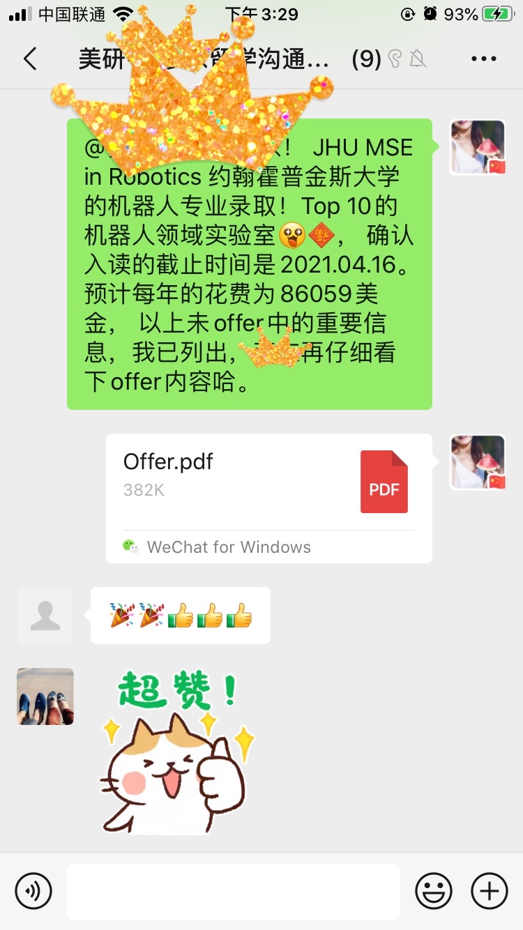 2021年2月,我的学生收获了第一个美国重磅offer,来自美国第一所现代意义的研究型大学约翰霍普金斯大学Johns Hopkins University。 US News全美排名第9,QS世界排名第25,这次被大名鼎鼎的Whiting工程学院下设的MSE Robotics项目录取的同学终于在自己不懈的坚持中克服了疫情期间刷分困难,科研任务繁重,顺利实现了自己的赴美留学梦想。