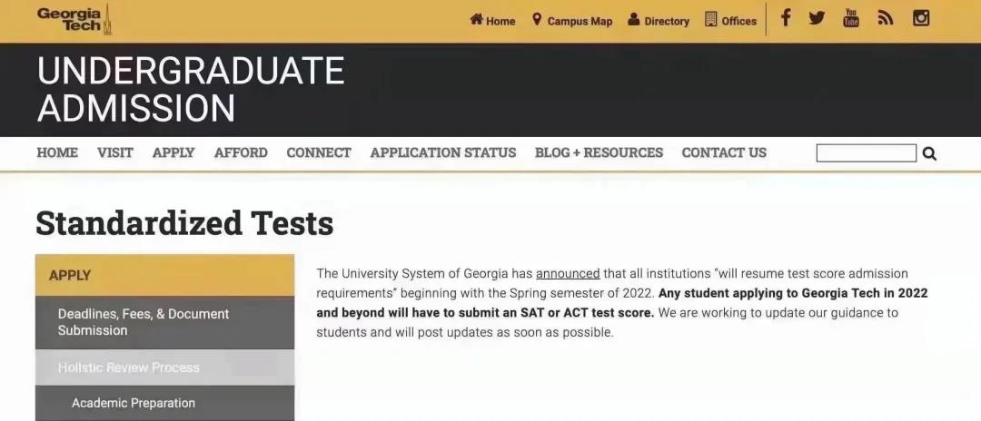 佐治亚理工学院在官网宣布:2022年春季及之后入学的学生,必须提交SAT/ACT成绩作为申请材料。