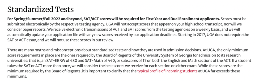 佐治亚大学官网显示:对于2022年春季及之后入学的学生,将恢复提交SAT/ACT成绩作为申请材料的要求。