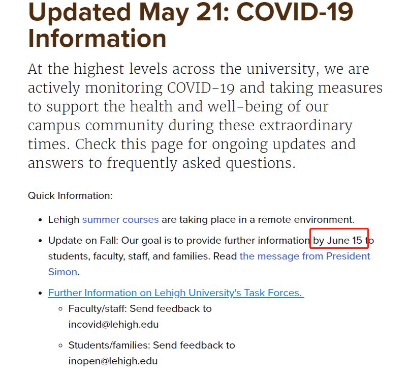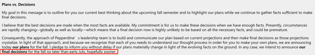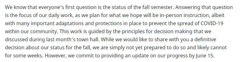 虽然我们想和你们分享一个关于秋季学期情况的最终决定,但还没有定论,我们承诺在6月15日之前提供最新进展情况。
