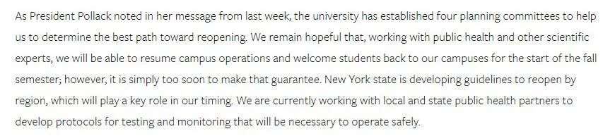 正如波拉克校长在上周的致辞中所指出,大学已经成立了四个规划委员会,帮助我们确定重新开放的最佳途径。我们仍然希望,与公共卫生和其他科学专家合作,我们将能够恢复校园运作并欢迎学生在秋季学期开始时回到我们的校园;