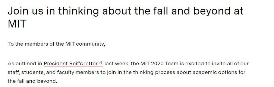麻省理工团队邀请所有的员工、学生和教职员工加入到秋季及未来的学术选择思考决策,提出关注点及意见建议。6月下旬到7月上旬,麻省理工学院将对秋季学期和2021学年的安排做出最终决定。