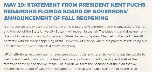 董事会宣布佛罗里达大学和其他州立大学系统将在秋季重新开放。