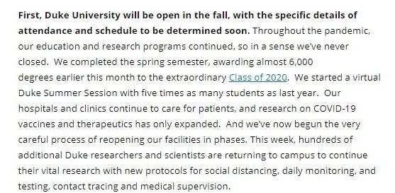 杜克大学将于秋季开学,具体的出勤情况和日程安排将在不久后确定。在大流行期间,教育和研究项目一直在继续,我们完成了春季学期,本月初为2020年的特别班授予了近6000个学位。