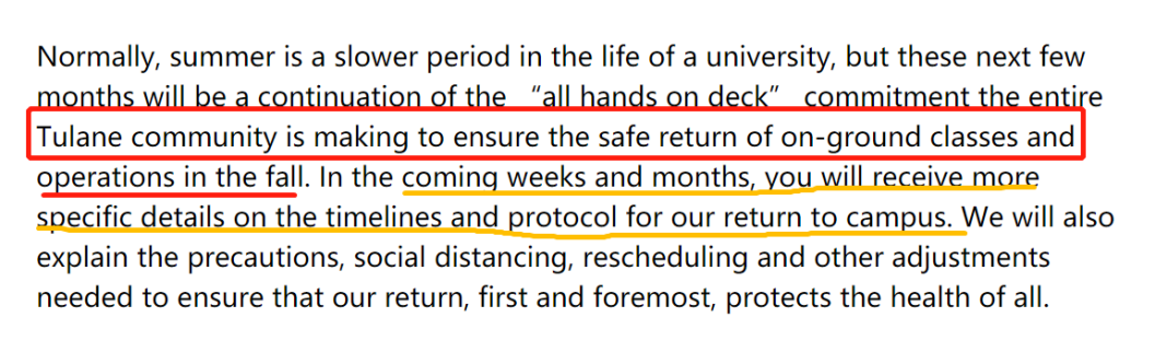 杜兰大学会在秋季开学,在接下来的一段时间内,大家会收到更多关于开学时间,和返校后的保护措施相关的信息。