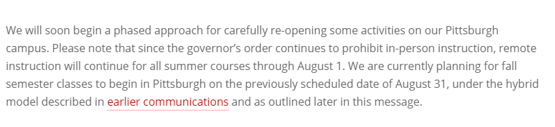 我们将很快开始分阶段重新开放匹兹堡校区的一些活动。由于当面授课仍被禁止,所有暑期课程的远程授课将持续至8月1日。目前正准备在计划开学的日期8月31日开始秋季学期的课程。