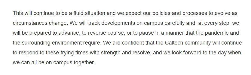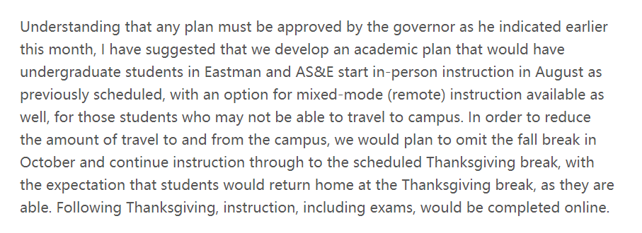 任何计划都必须得到州长的批准,所以建议我们制定一个学术计划,让Eastman和AS&E的本科生按照之前的计划在8月开始面对面授课,并提供混合模式(远程)教学的选项给可能无法返校的学生。
