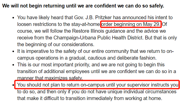 学校宣布直到确认安全性,是不会开始让大家返校的,具体的返校计划要等你的supervisor通知。