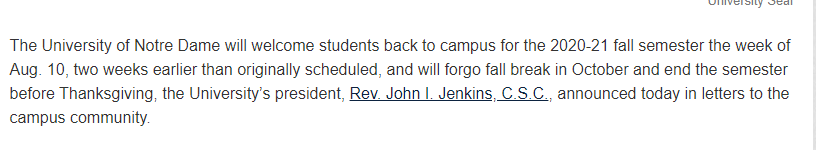 圣母大学将于8月10日(比原定时间提前两周)迎来2020-21学年秋季学期的学生重返校园,并将取消10月份的秋季假期,在感恩节前结束这一学期。
