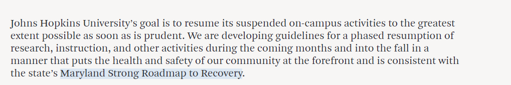 约翰霍普金斯大学的目标是,在谨慎的情况下,尽快恢复暂停的校内活动。我们正在制定指导方针,以便在未来几个月和秋季分阶段恢复研究、教学和其他活动,社区健康和安全处于最重要的位置,这符合马里兰州强有力的恢复政策。