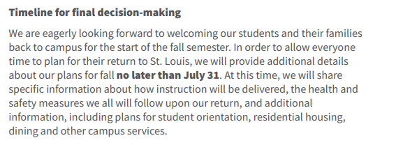 我们热切期待着欢迎我们的学生和他们的家人在秋季学期开始时回到校园。为了让每个人计划他们返回圣路易斯的时间,我们将不迟于7月31日提供更多的细节性计划。