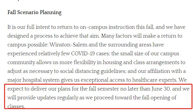 许多因素将使重返校园成为可能:温斯顿·塞勒姆和周边地区的COVID-19病例相对较少;校园社区的规模较小,使我们在住房和班级安排方面有了更大的灵活性,可以根据社交距离准则进行必要的调整;与一家大型医院系统的合作,使我们能够非常方便地接触医疗专家。