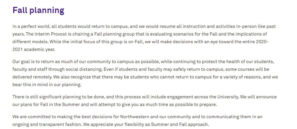 随着这一流行病在未来几个月的发展,我们的规划工作正以这些优先事项为指导:学术质量,公共卫生,政府指导,财务可持续性,并将在6月底之前就秋季季度的计划做出决定。