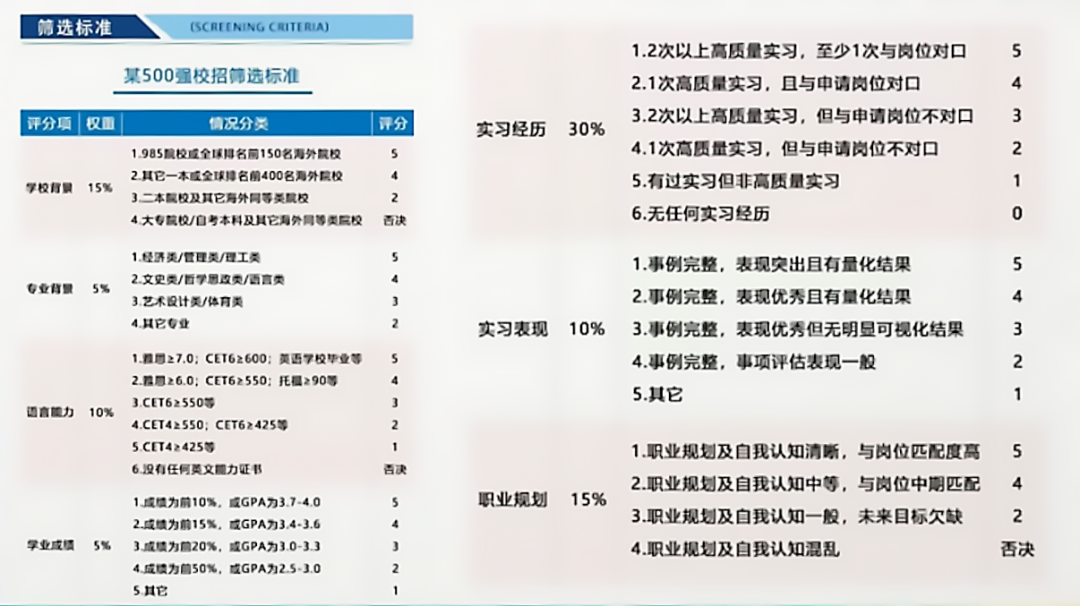 可以看到占比最高的第一个就是实习经历30%,其次是职业规划15%,实习表现10%。