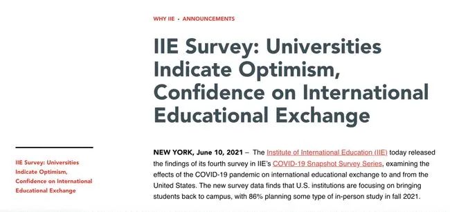 IIE本次调查要求受访者评估新冠病毒对美国高校和全球往返美国的学生流动的影响,包括414所高校,于2021年4月15日至5月5日期间收集数据。
