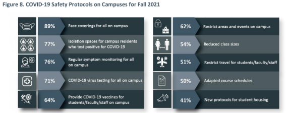 同时为了确保校园内每个人的安全,不少学校要求返校学生和教职工接种疫苗,同时制定相关校园安全协议,包括戴口罩要求、病毒检测等。