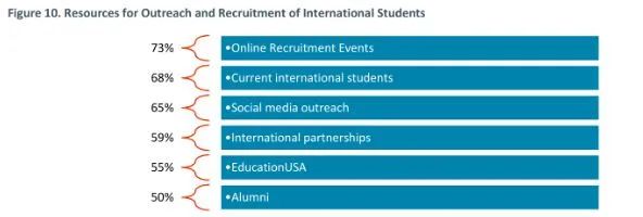各种创新和多样化方式招收国际学生,77%的大学在招生方面投入更多财力,比如举办线上宣讲会、与在读国际学生合作、使用社