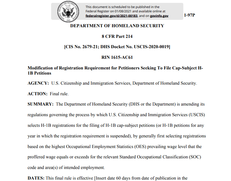 意味着从2021年4月份起,H-1B签证将会按照新规则(职位高低),在老工资要求的基础上,进行抽签分配。