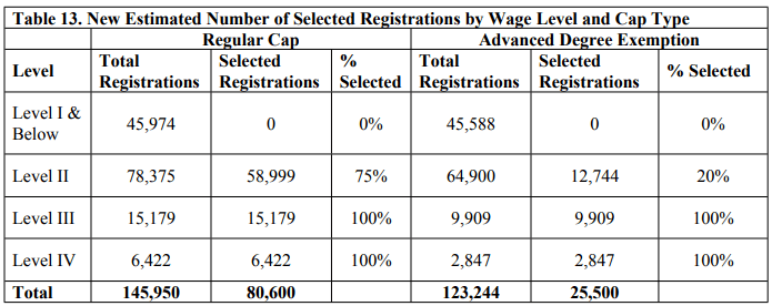 国土安全部预测,根据新规则, 最低级别(1级)的申请人都不会入选,2级别大概只有75%能在常规配额获签,20%在额外高等学历配额获签,3级和4级是100%抽签命中率。