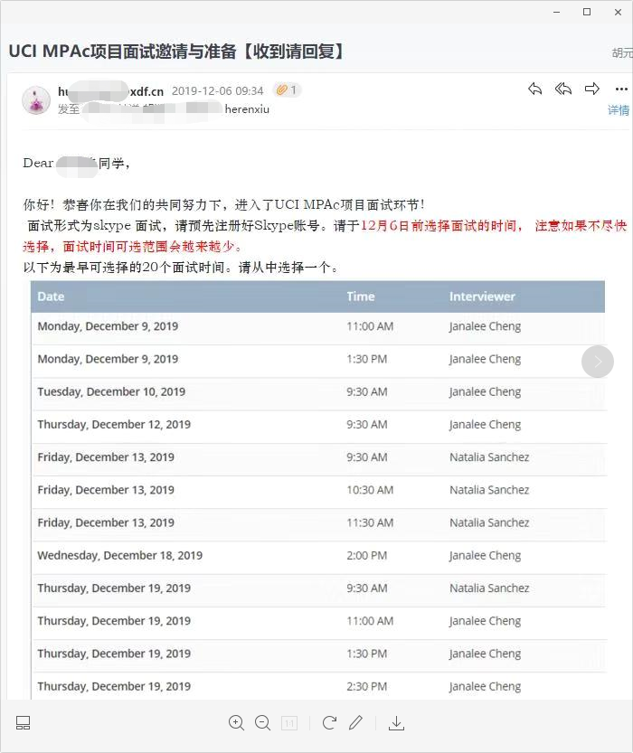 学生在12月6日收到了学校的面试邀请,我们文案老师第一时间整理相关信息发与学生: