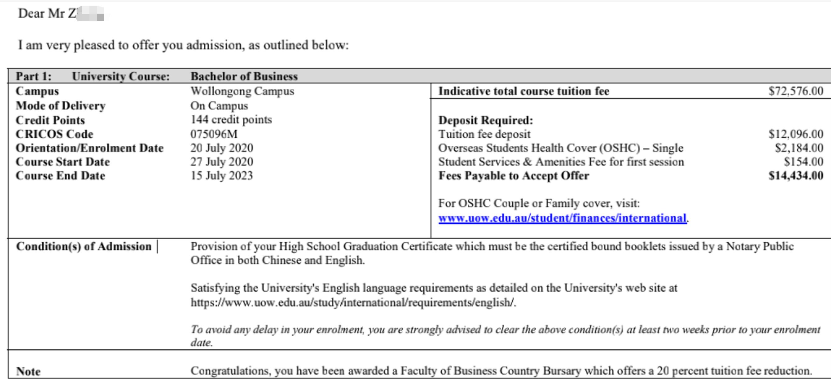 在不懈努力下,Z同学收获了澳大利亚伍伦贡大学(全球排名212名)的本科商务专业的录取,成功的从被拒签一次,逆袭拿到全球排名212的大学本科录取,并被豁免了20%的学费!