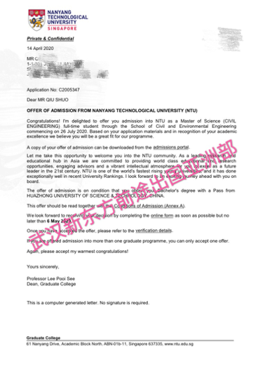 新加坡南洋理工大学土木工程及国际建造管理双料录取!