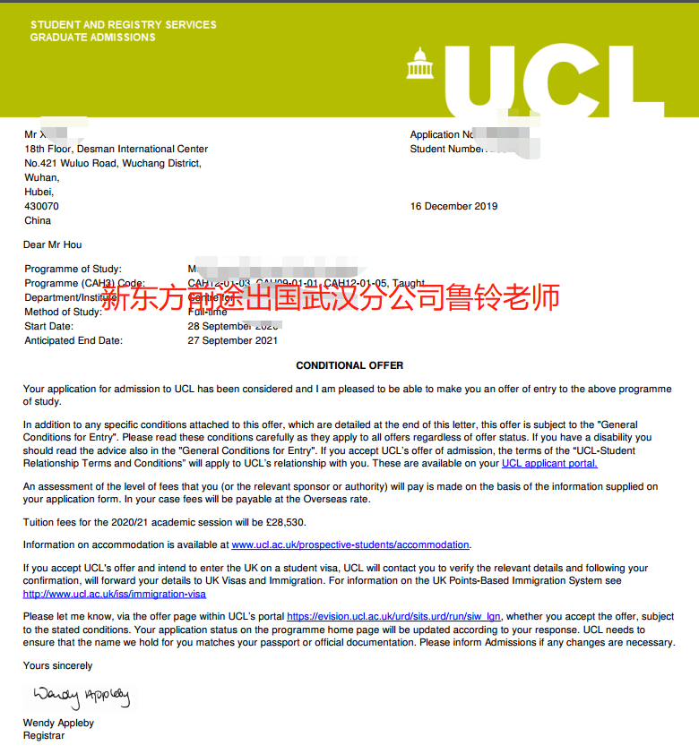 学生爸爸妈妈是东北的,当时咨询还是蛮戏剧化的,学生爸爸妈妈正好来武汉旅游,抽了个半天来咨询了我,当时咨询的时候孩子的绩点是2.9多,妈妈心里最心仪的学校就是伦敦大学学院,咨询完之后爸爸妈妈就回老家了,一直保持联系(其实我当时觉得应该继续找我报名的可能性不大,因为孩子也有自己的想法,并且就在武大,可能会自己去咨询其他的中介或者新东方的其他老师,因为我当时连孩子的名字都不知道,妈妈觉得孩子在备考雅思不想打扰孩子所以就没把孩子联系方式给我,经常会有这样咨询的后面就不了了之了)。不过还好妈妈一直坚持让孩子找我,孩子在去参加完英国夏校之后回来就直接跟我沟通院校和专业,然后在去年暑假夏校结束后过来找我的时候报名了留学。也非常感谢妈妈的坚持和学生的信任,对我给建议的学校和专业也非常认可,最终以3.05的gpa拿到了QS世界排名第八的伦敦大学学院的录取。
