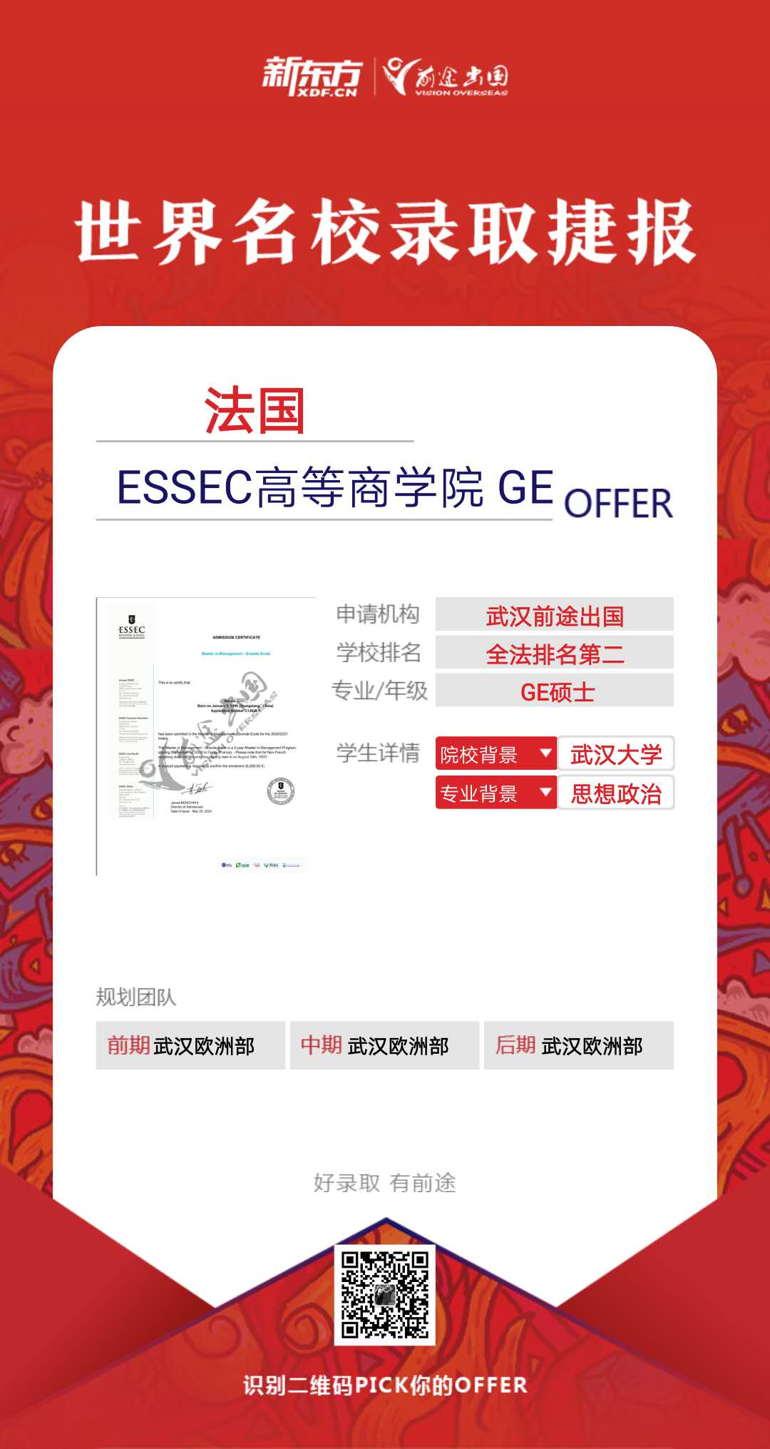 录取院校:法国ESSEC高等商学院 管理学硕士录取(GE)