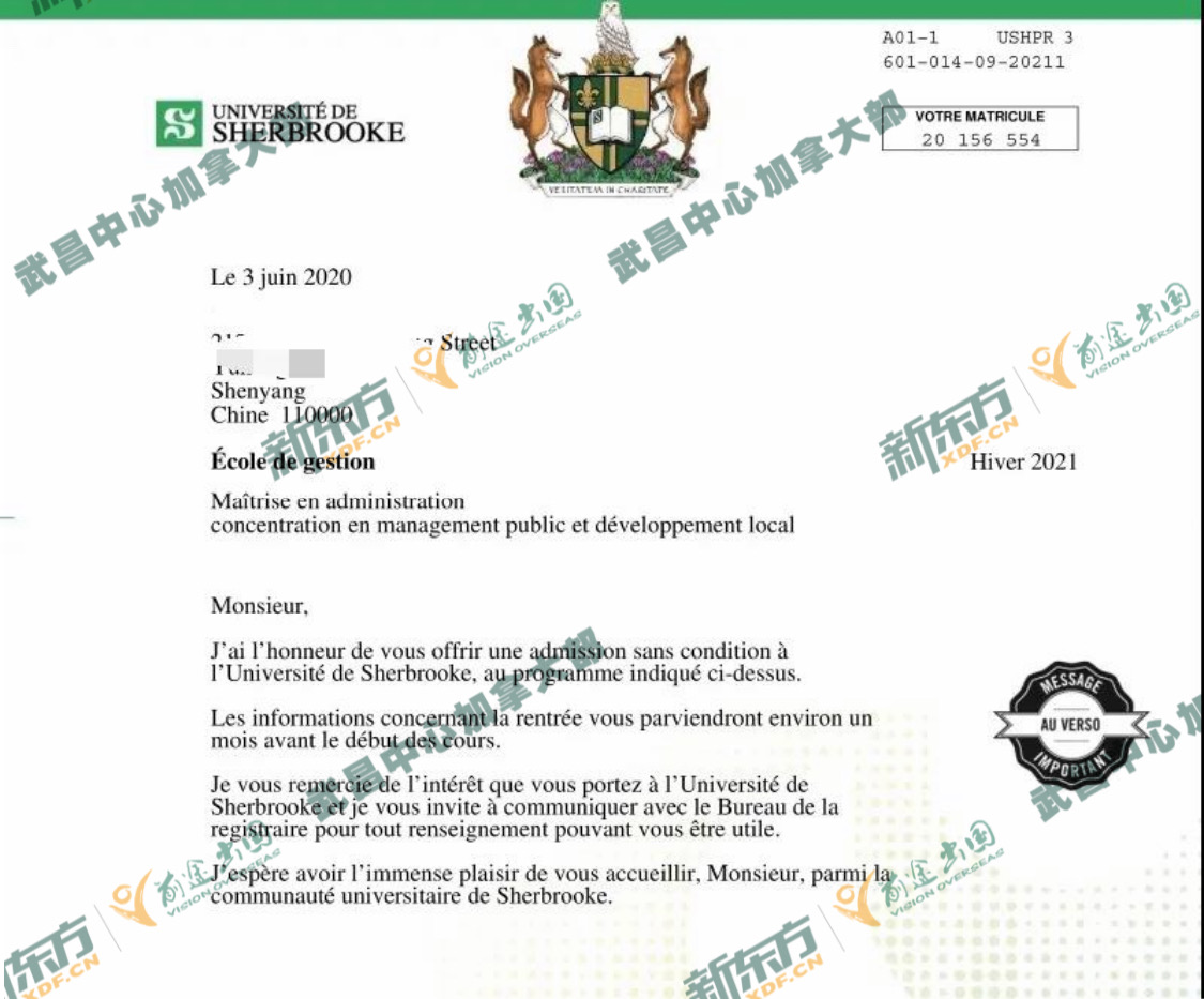 由于魁省的教育与其他省份存在差异,我们在选校时更加认真仔细的去逐一去确认每个专业的信息和申请要求,最终在我们与学生的共同努力下,学生成功拿到了心仪院校谢布鲁克大学的offer。