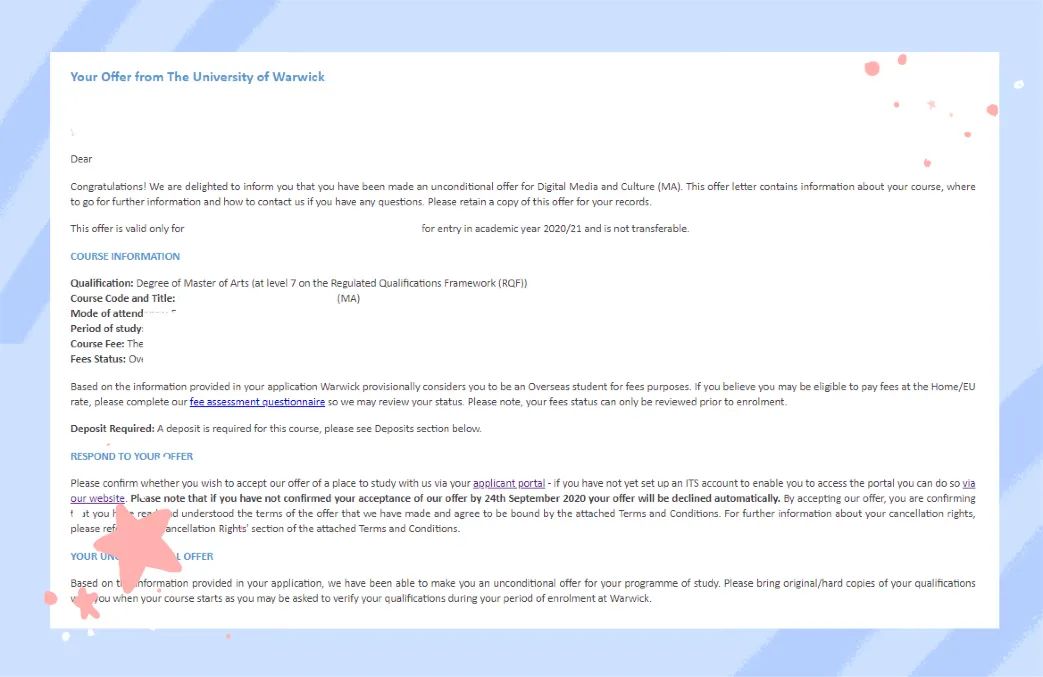 wenshu制作完毕,整理好所有申请材料后在deadline前完成了所有学校和专业的递交。一个月后,我们收到了华威大学的offer!