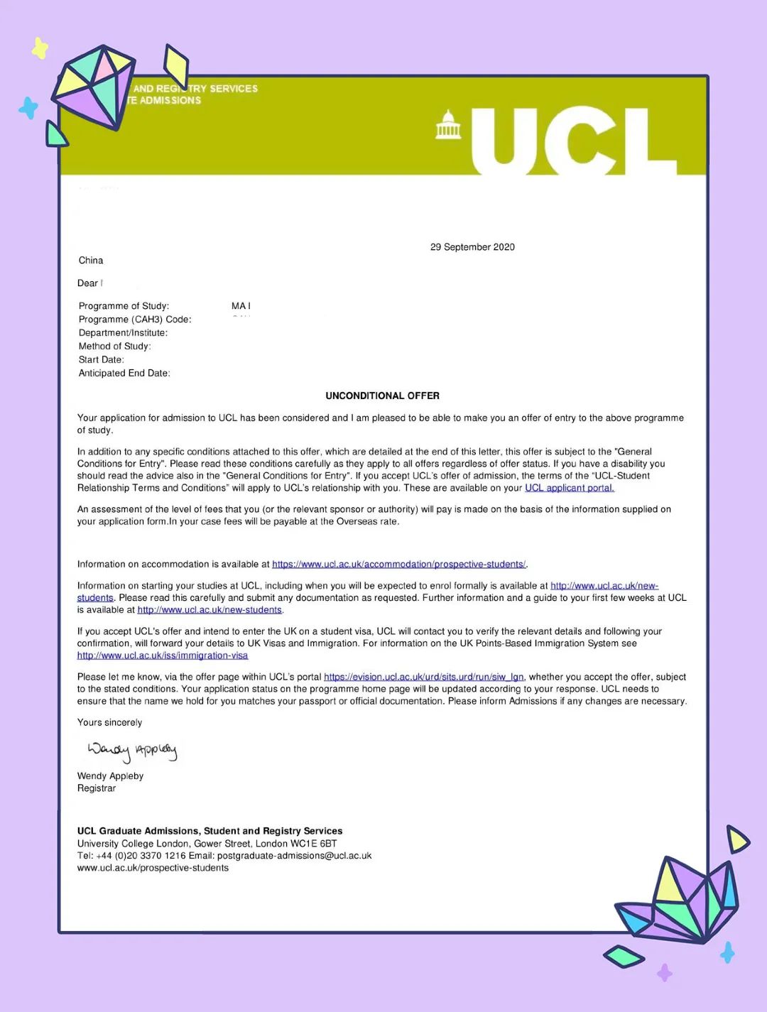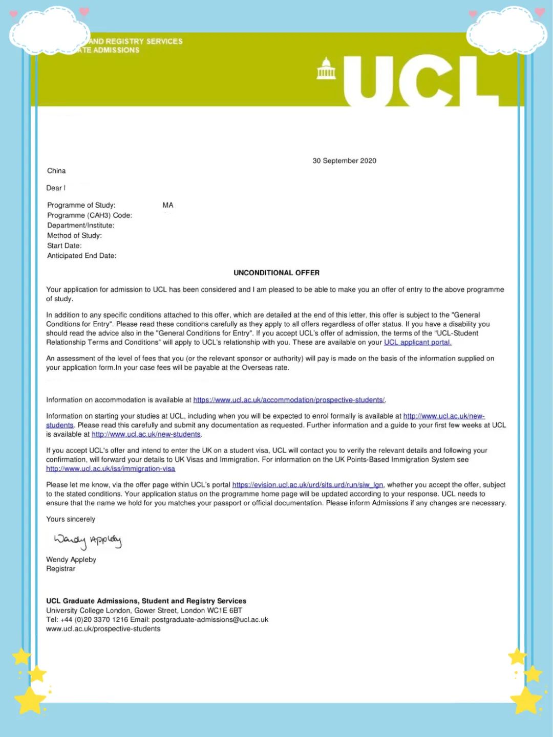 转眼到了UCL开学前一周,还是没有消息,今年因为疫情的原因,学校的工作人员大多在家办公,开学前的一周我们每天都在给招生办公室的人打电话,都没有人接听,我们又给学校发了邮件,在开学后的两天,终于!等到了UCL的offer!!