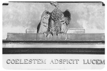 在位于Frue Plads的古老的大学主楼的正门之上,栖着一鹰,其下就是哥本哈根大学的校训 [14] 。原文为拉丁文“Coelestem adspicit lucem”(全句为“Sublimia petens ingenium/Coelestem adspicit lucem”)。丹麦文为 "Den øjner det himmelske lys"。 [15]