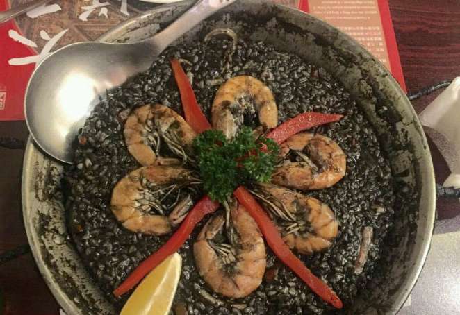 一个简单的餐前面包之后火腿拼盘端了出来,这是一道黑白猪混合拼盘,虽然不是伊比利亚原产,但是配上新鲜的哈密瓜也是最正宗的吃法了。位于官也街的唐吉柯德餐厅是澳门少有的西班牙菜餐厅之一,在这个昏黄灯光的家庭小馆里你不能奢求到最昂贵的食材,当然——你也不用付高昂的价格。偶尔你会发现海鲜饭锅底有点脆脆的饭焦了,就像家里做的菜,少不了那么一点瑕疵,但是在那样的温馨氛围下也都一笑了之。