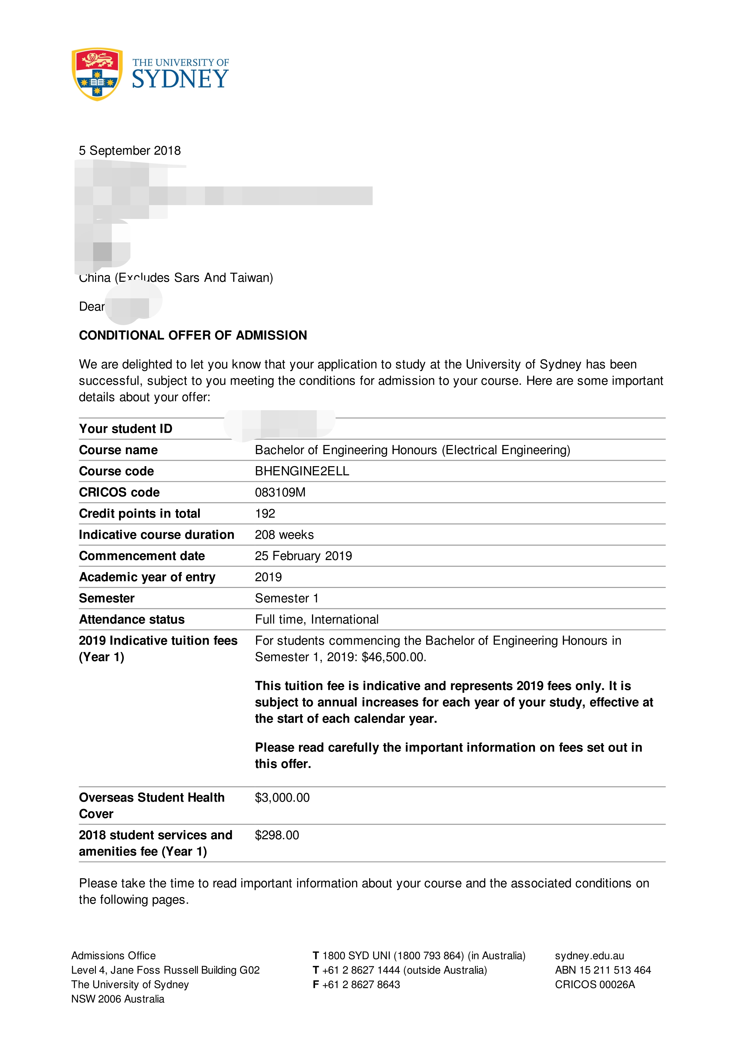 高考直录悉尼大学电子工程荣誉学士申请成功案例