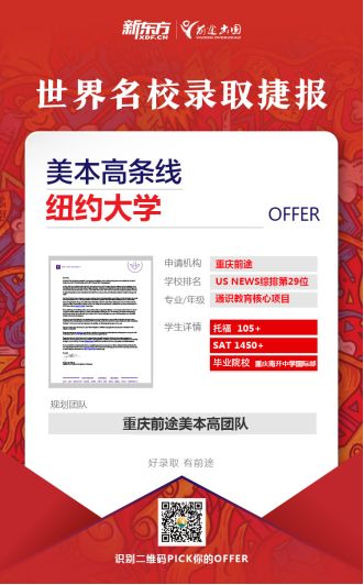 小Z同学的主文书以他在北大培文杯中获奖的文章为主线,讲述了他是如何与写作结缘并且萌发了通过文字的力量反映社会现实,直击人心,从而为社会带来积极影响。既结合了他的文学特长,同时也体现出了他极强的创造力、批判性思维以及社会责任感,而这些能力无论是将来进行文理科的学习,对名校在选择学生的过程中而言都是至关重要的。NYU的小文书在老师的指导下经过多次修改,充分结合了学校的气质和课程特点,与小Z同学自身文理兼备的背景进行了联系,表现出自己对学校的热爱和匹配。院校解读