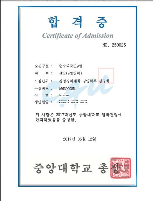 这位同学在国内完成高中课程,在校平时成绩蛮不错的。毕业后先去高丽大学的语学堂,同时学生也算是比较努力的,在申本科的时候先用高丽语学堂的4级在读提交申请,经过努力最后拿到了中央经营学的录取。