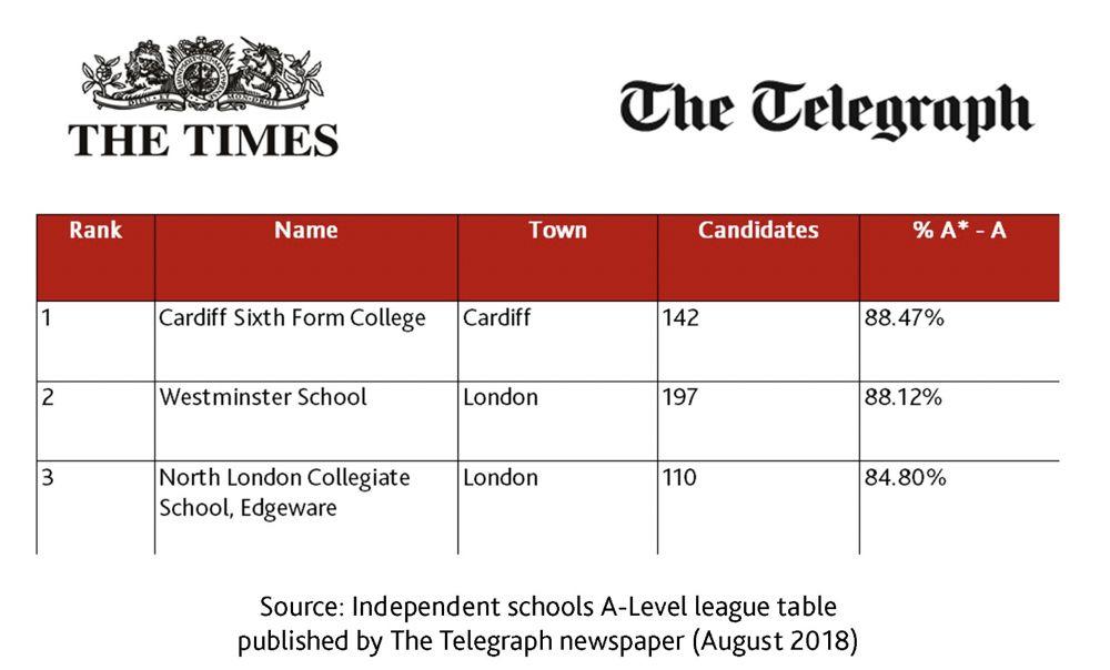 卡迪夫学院于2018年再度登上泰晤士报与每日电讯英国私校排行榜榜首。这已是卡迪夫学院自2010年起第八年成为私立学校排行榜榜首了。