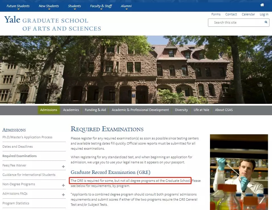 GRE虽是研究生申请的必备条件,但很多学校官网并不会直接给出GRE要求分数,只是告诉你得提交。比如耶鲁大学研究生院,在官网招生公告中,只提到要求GRE成绩提交,却没有提及最低要求。申请人只能参考往年的录取数据。