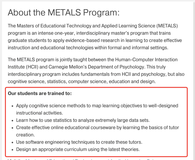 一提到这个学校,首先想到的就是计算机,这个学校的所有专业,或多或少都跟计算机挂钩,所以教育技术这个专业的开设也是非常硬核的;为期一年的跨学科硕士课程,旨在培训研究生成为有学习能力的工程师和LX(学习经验)设计师。在这些角色中,我们的毕业生应用科学的学习原则,基于证据的研究,定性和定量的认知任务分析,和数据驱动的方法来设计,创造和改善教育资源和技术;毕业生走向基本上也是教学工程师、教学设计者和评价者、课程开发人员、项目经理、教育数据科学家、教育技术顾问、用户体验设计师等;这个专业,2019年招了29个学生;非计算机背景的学生,需要学生展现比较强的编程能力,C++、Java、python等。