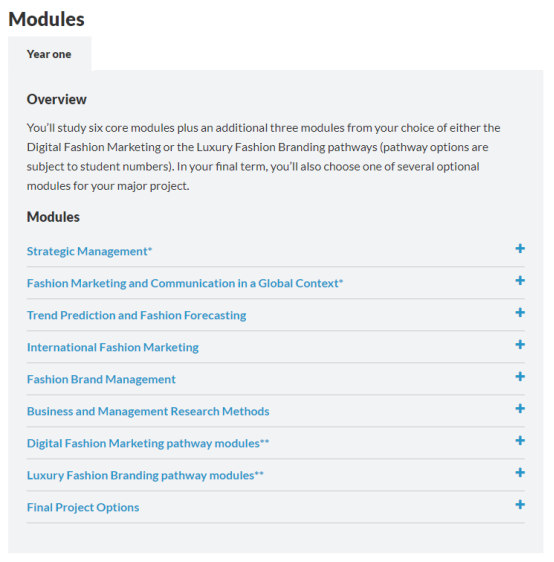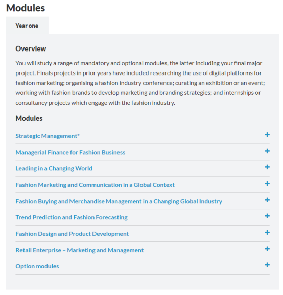 该课程带领学生真正进入时尚行业并且了解其内部复杂的工作环节,从最初的产品开发、设计理念到后期的销售规划及品牌推广。还使学生们一起参与当中,例如在第二学期,学生们将收到学校合作伙伴的邀请,一起免费前往意大利参加米兰时装周。