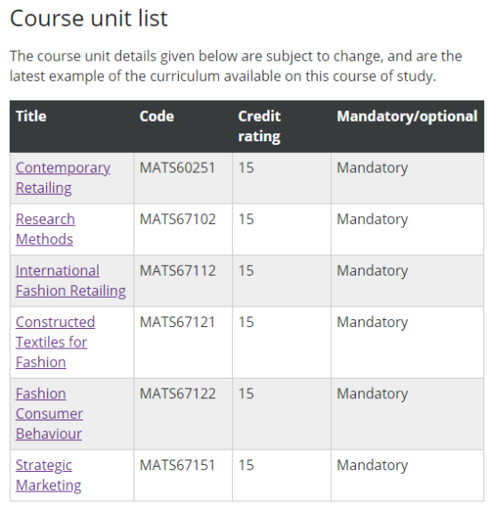 本课程适合于商科类专业本科毕业生申请,或在管理、市场营销、零售、或生产方面有高水平的经验,并对时装工业有一定了解的人。课程要求学生具有独立研究和学习的能力,以往的研究课题包括:伦敦服装产业的发展前景、伦敦女童装的购买行为、打开韩国零售市场的市场战略、亚欧编织生产原料分析、电子商务销售渠道成功因素。