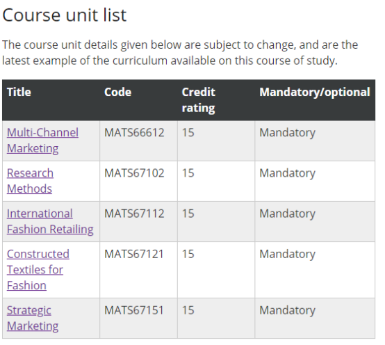 In the second term you will build on your knowledge of Global Business Strategies and continue to enhance your industry skills in the Global Fashion Brand Marketing module. This will also be supported with modules in Project Management and Research & Professional Skills, letting you practise making research proposals and designing pilot studies for industry related projects.