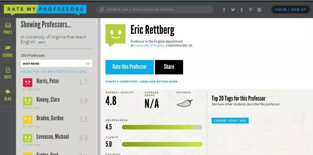 ■ Rate my professor 每个学期初大家选课的时候总是纠结要选哪个老师的课。老师人好不好,考试难不难,会不会课上随便点人回答问题,课程好过吗等等问题,这个网站都可以帮你解答。 Rate my professor是上过这门课的学长和学姐来给教授评分的网站。输入自己的学校和教授名字,你可以看到所有人对于这个教授的评价,以及学长学姐上这节课的经验。