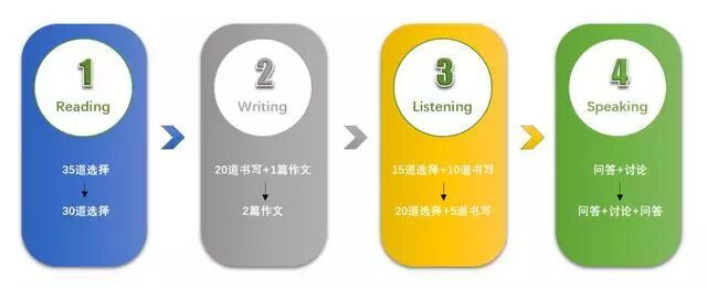 口语题型没有更改,只是做了顺序的调整,part2和part3部分顺序进行了调换。时间10-12分钟。