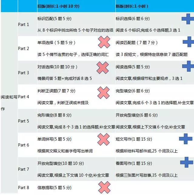 阅读part3由原来的情景会话题变成了传统型阅读理解,参考了PET part4的题型,新题型文本较长,阅读量加大。