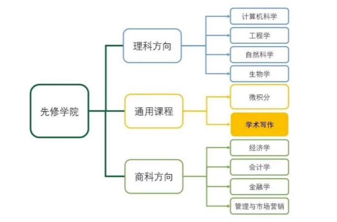 通用课程:学术英语写作【EAP】、微积分【CAL】 商科方向课程:经济学【ECO】、会计学【ACC】、金融学【FIN】、管理与市场营销【MM】 理科方向课程:计算机科学【CS】、工程学【ENG】、物理与化学【SC】、生物学【BIO】
