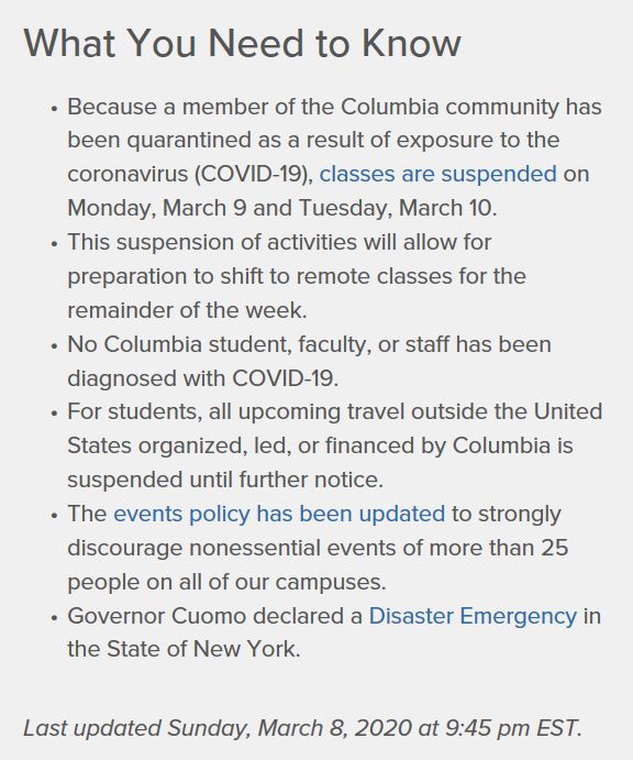 暂时看来,一些冠状病毒特别高发区域的学校都有了相应措施。如:华盛顿大学和斯坦福大学开始暂停线下授课,开始线上授课,没有明确恢复时间;哥大暂时停课两天,本周后续也可能继续网络授课;南加州大学和加州大学伯克利大学等,都是线上试运行,观察情况后,随时警戒。而其他美国大部分学校都属正常,只是针对某些区域国家近期到美国的学生进行隔离后开始恢复线下上课。