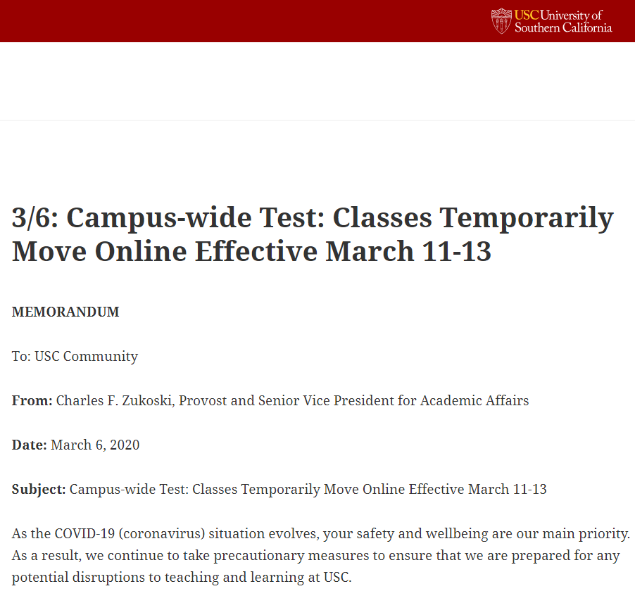 南加州大学网课试运行。根据USC目前发布的消息,从3月11日开始一直持续到3月13日,课程将暂时在线开展,以在冠状病毒问题上测试其“在线环境下学术连续性的技术能力”。