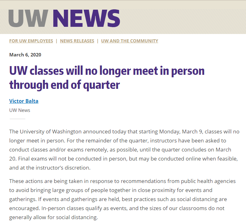 华盛顿大学宣布停止线下授课,将未来一段时间的课程转移到线上进行。华盛顿大学三个校区加起来一共有 5 万余名学生。